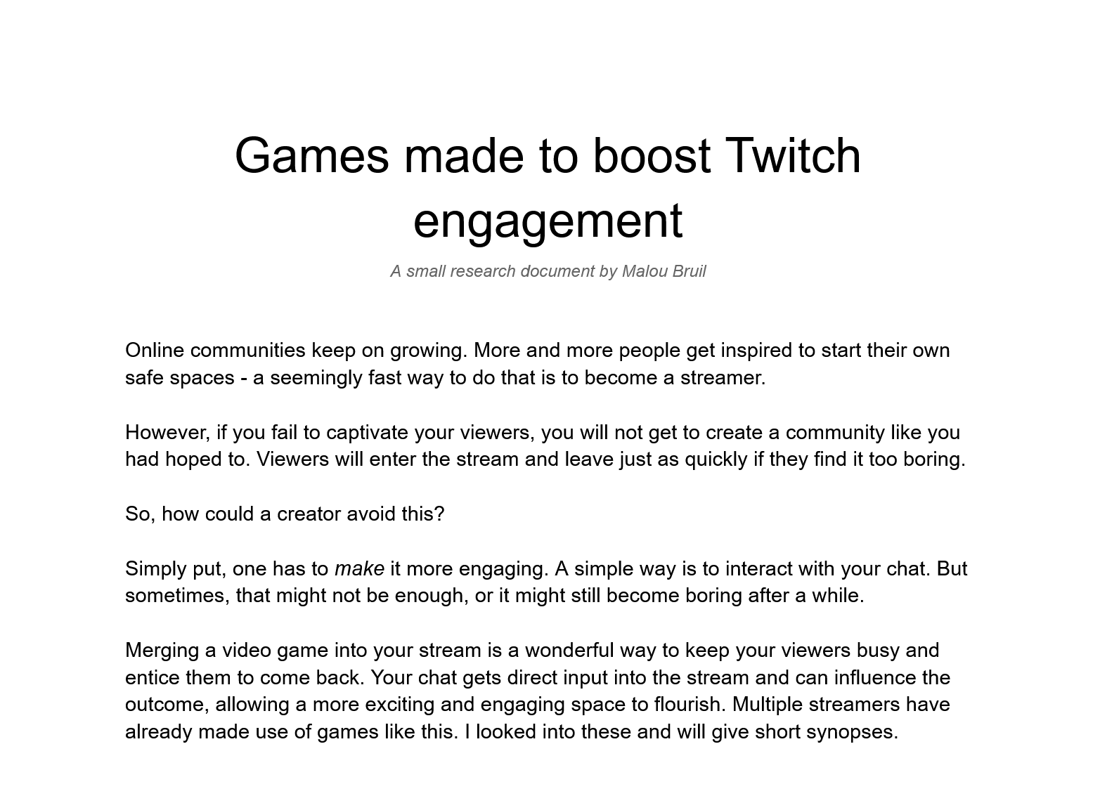 We sat with our group and began thinking about existing examples we could use. We came up with research topics to make this easier and break up all the possibilities we had. I got the topic of existing Twitch integrated games, which I made a document of. Find the PDF here.