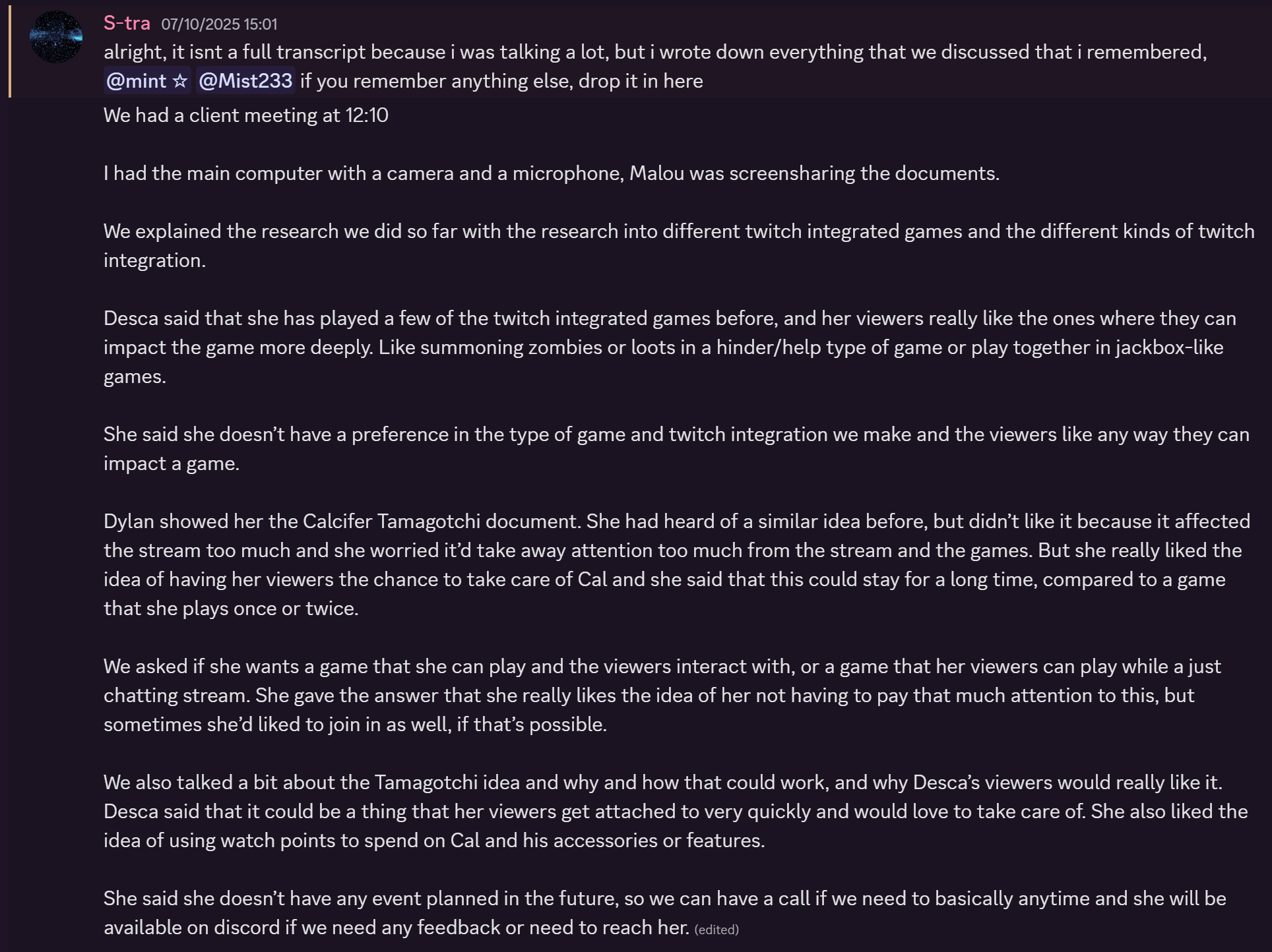 We then had a meeting with Desca where we discussed our work so far. This included asking questions about her own ideas, followed by our proposal of the Tamagotchi concept. My groupmate made a transcript of it.