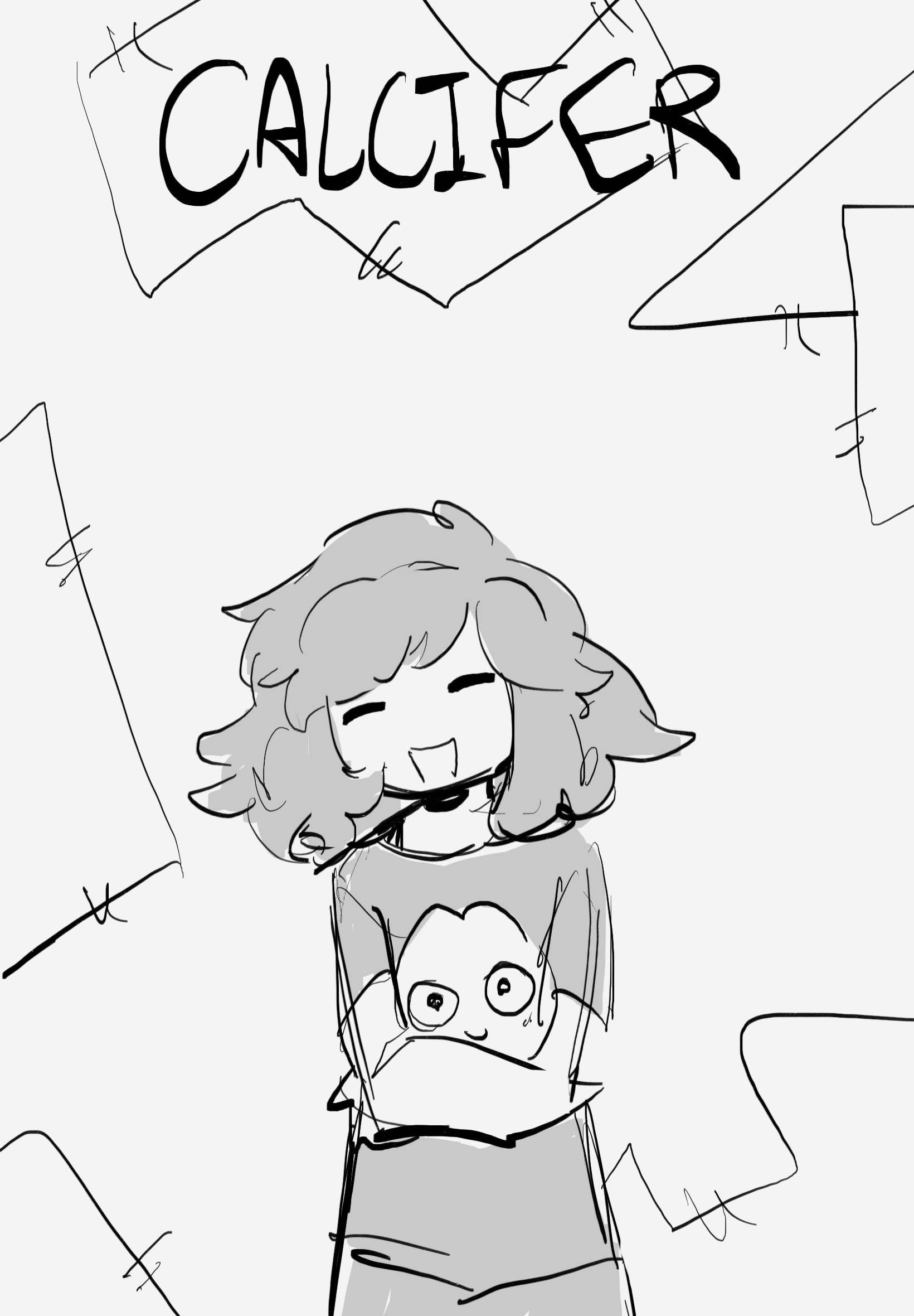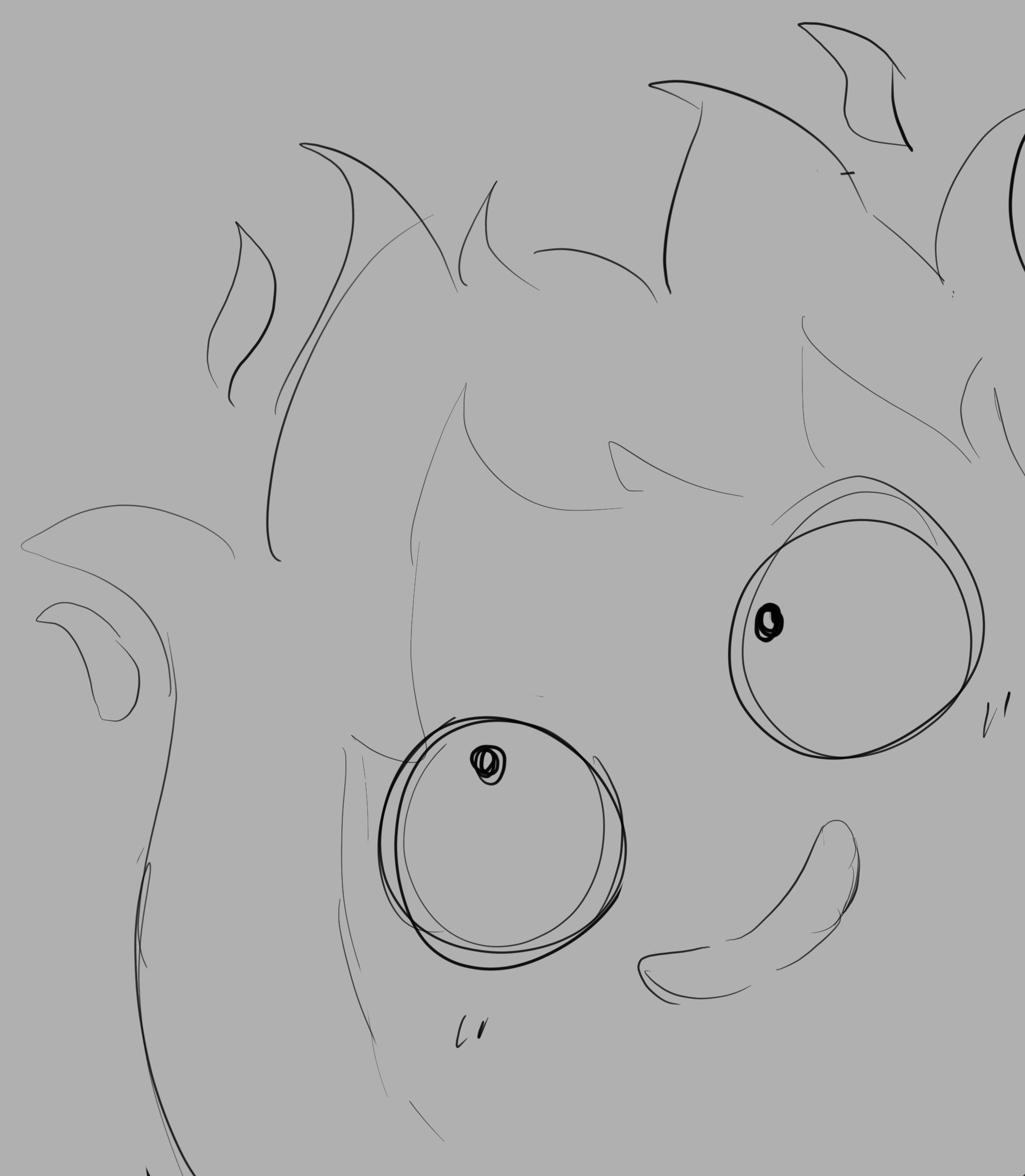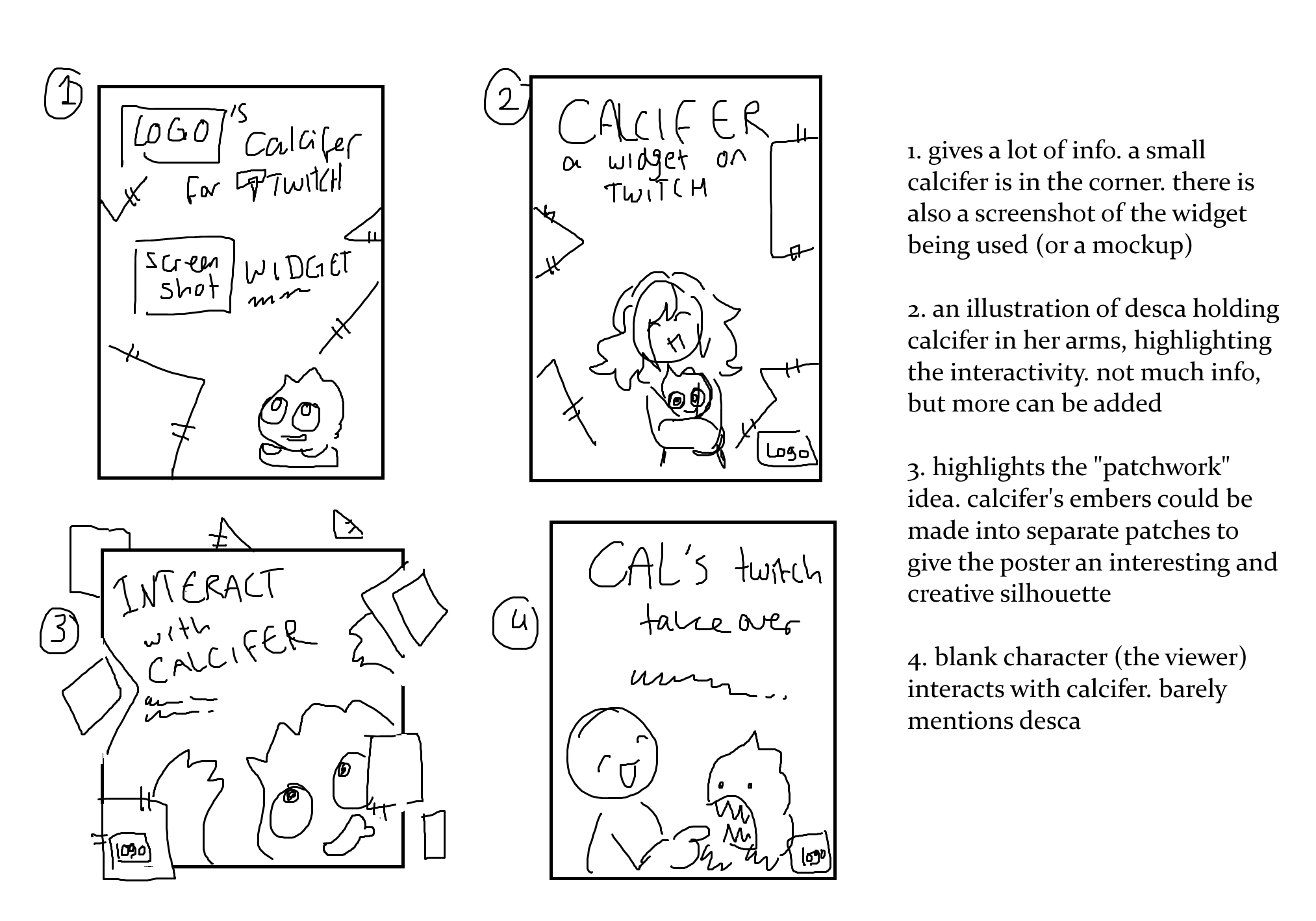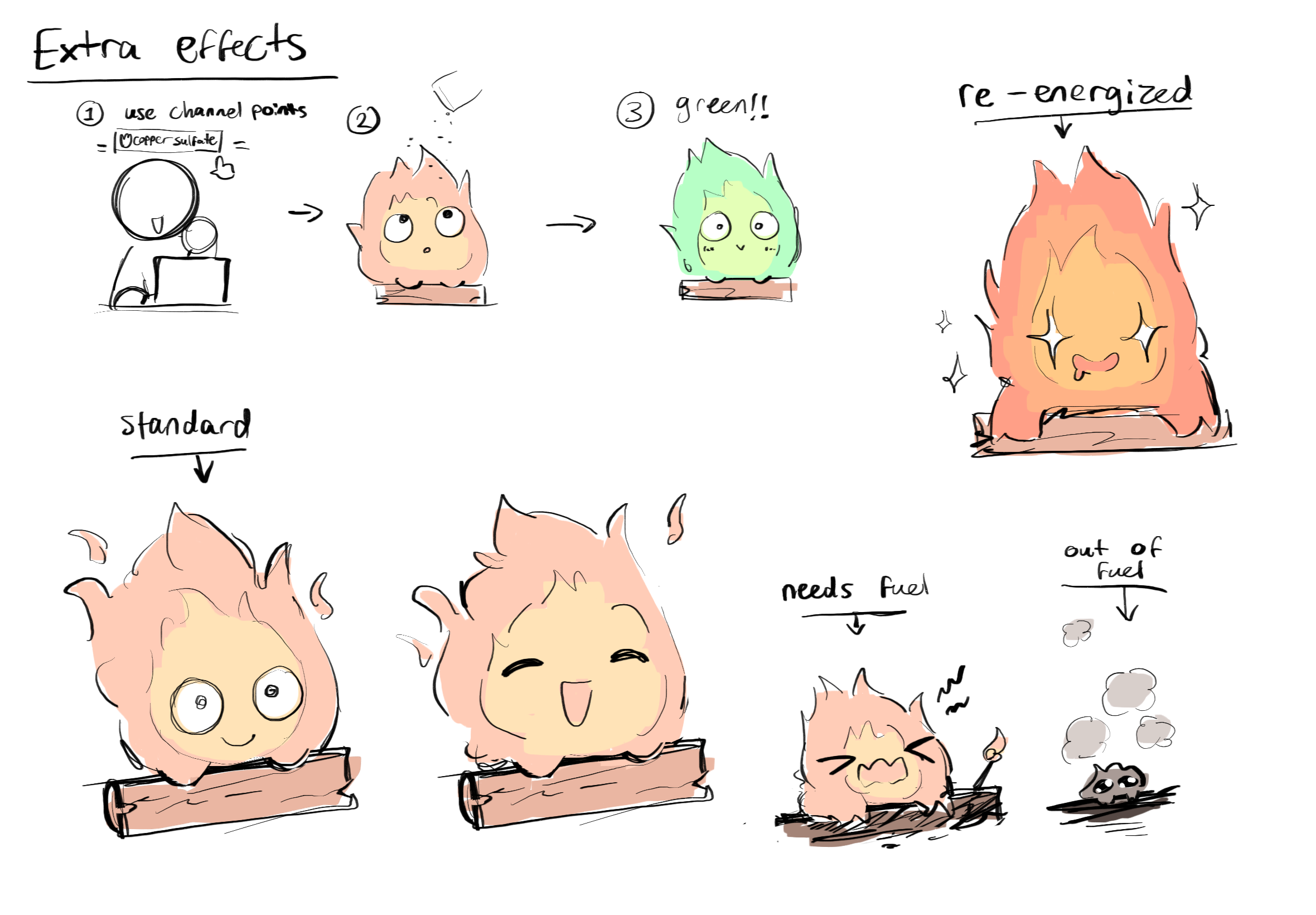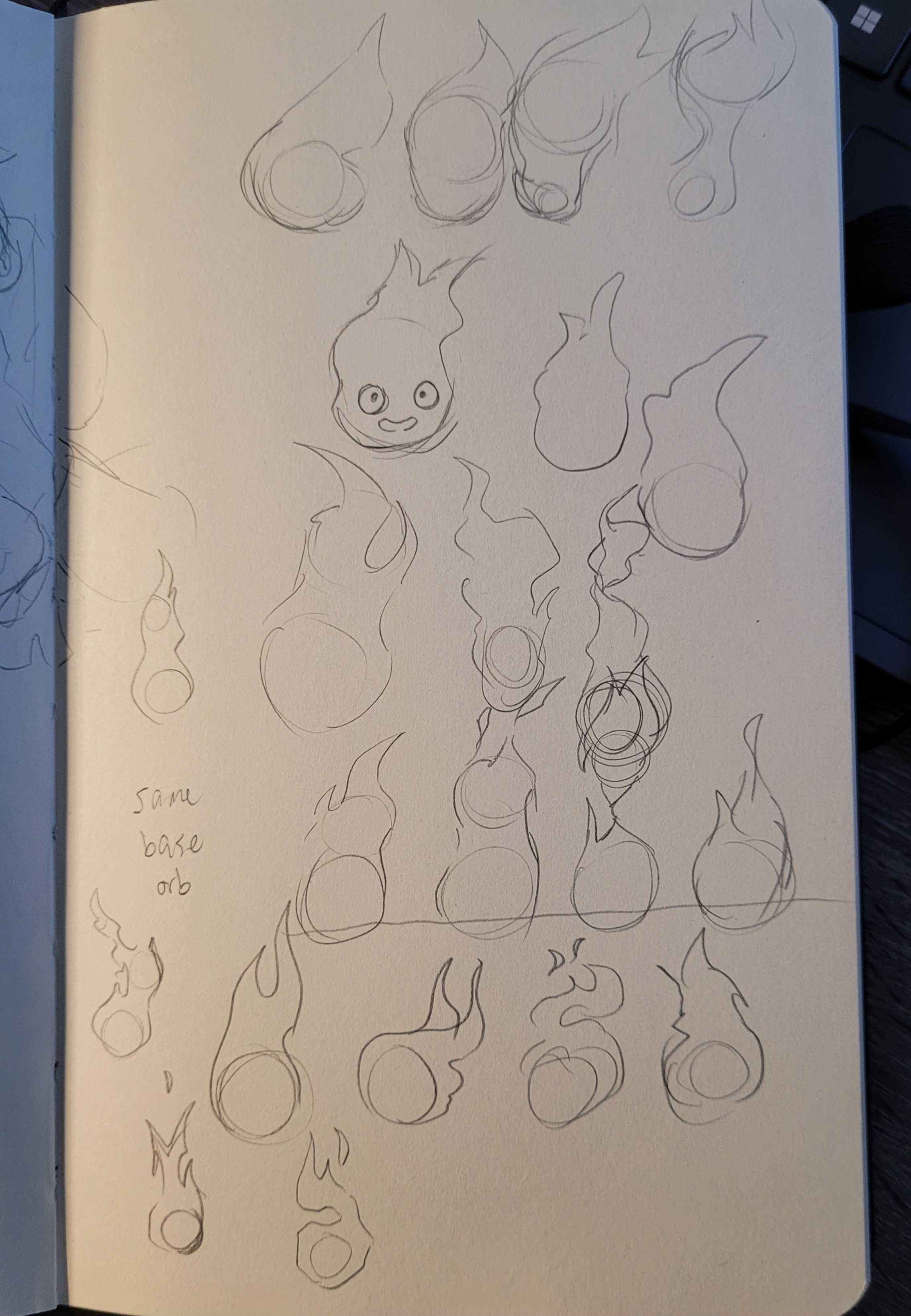 Following this, I created a few sketches of possibilities and what it could look like. For the character, we decided to go with Calcifer from Howl's Moving Castle. This character has a strong meaning and story in the Desca lore, cartoony, and simple to draw. (mostly. more on that later)
