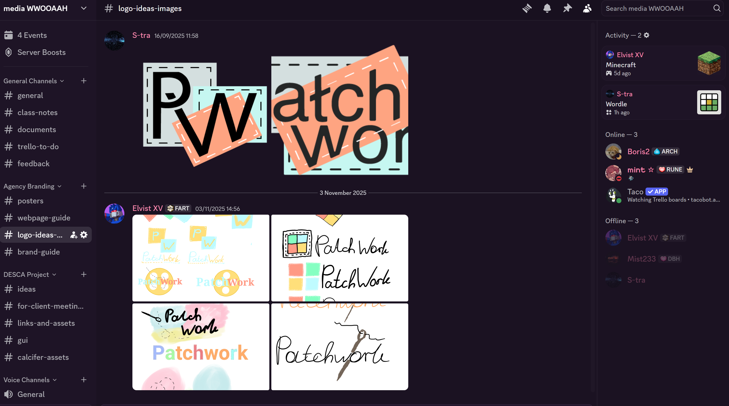 For organization, we mostly used Discord. Discord is nice and easy to use. Channels and categories for different subjects can be made, and sending files works nicely as well. Pinned messages can be used to take note of important things.