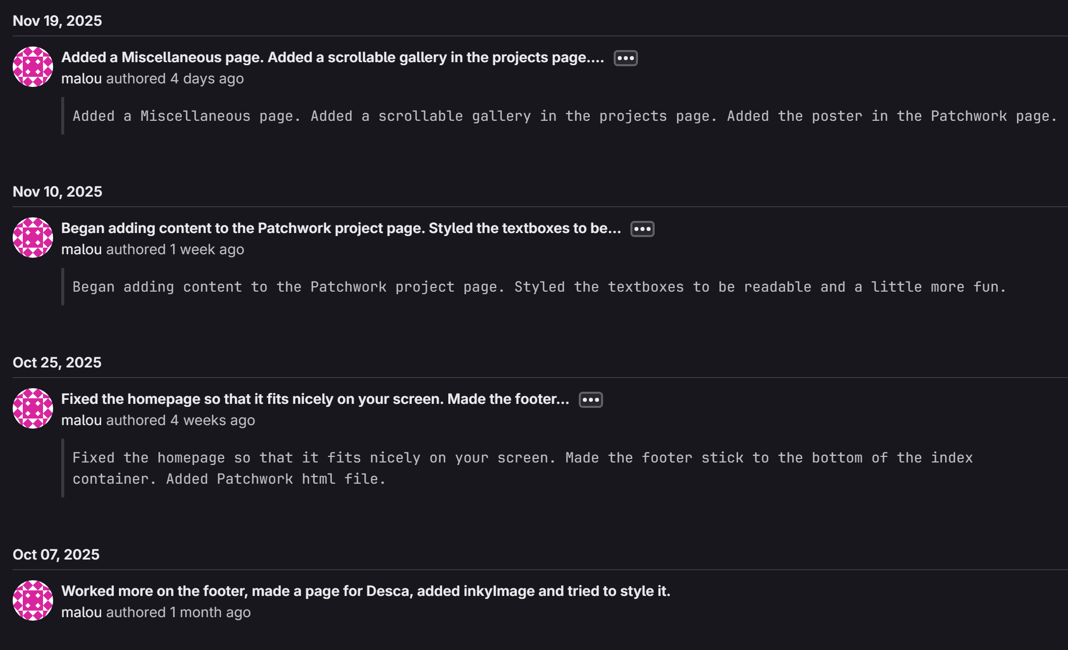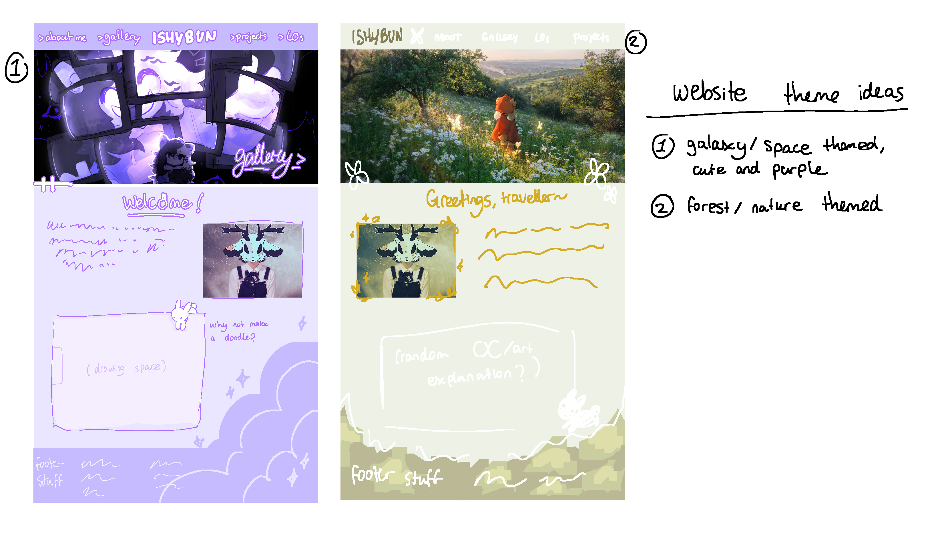 I made some quick ideas for my portfolio website. I know they’re pretty barebones and not that exceptional, but it works for my goals this semester. I'd prefer to focus on having fun with my website and taking it easy while putting more effort into my group project, for example. I ended up sticking with the purple idea because find it easier to work with than green.