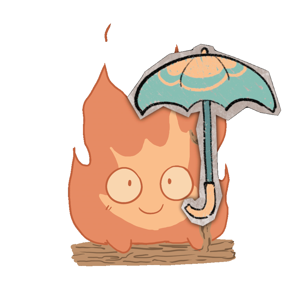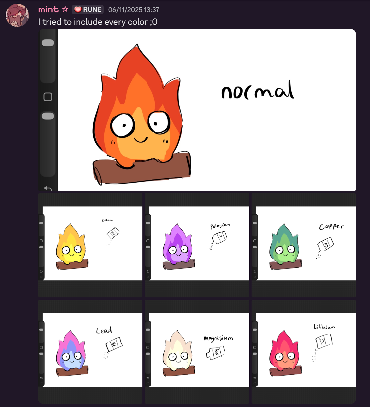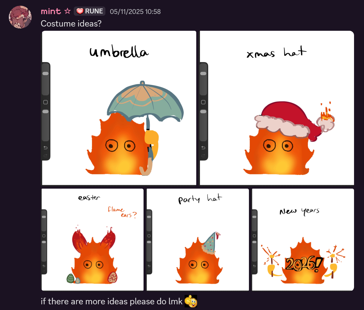 Following this, I created a few sketches of possibilities and what it could look like. For the character, we decided to go with Calcifer from Howl's Moving Castle. This character has a strong meaning and story in the Desca lore, cartoony, and simple to draw. (mostly. more on that later)