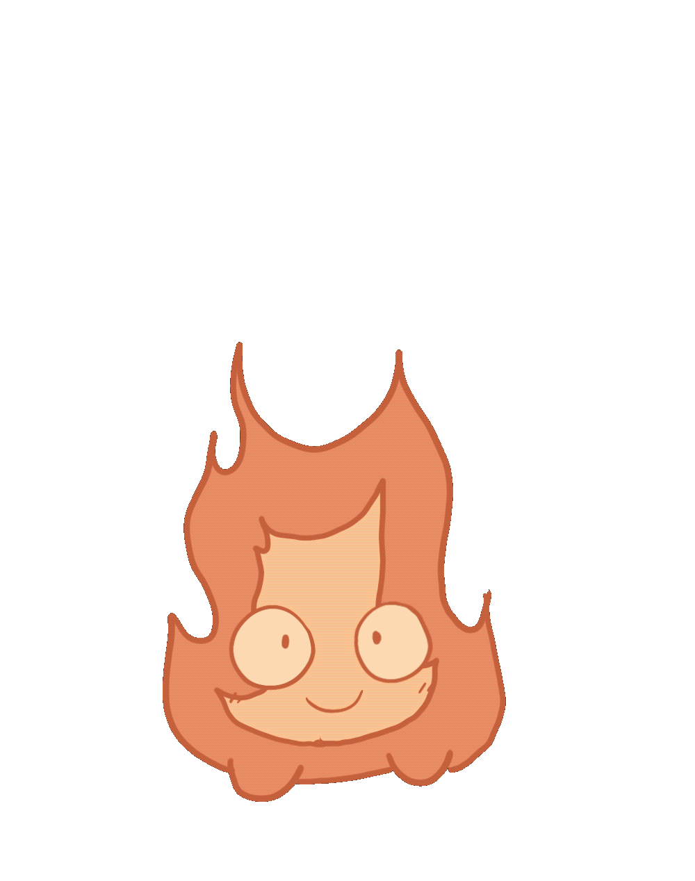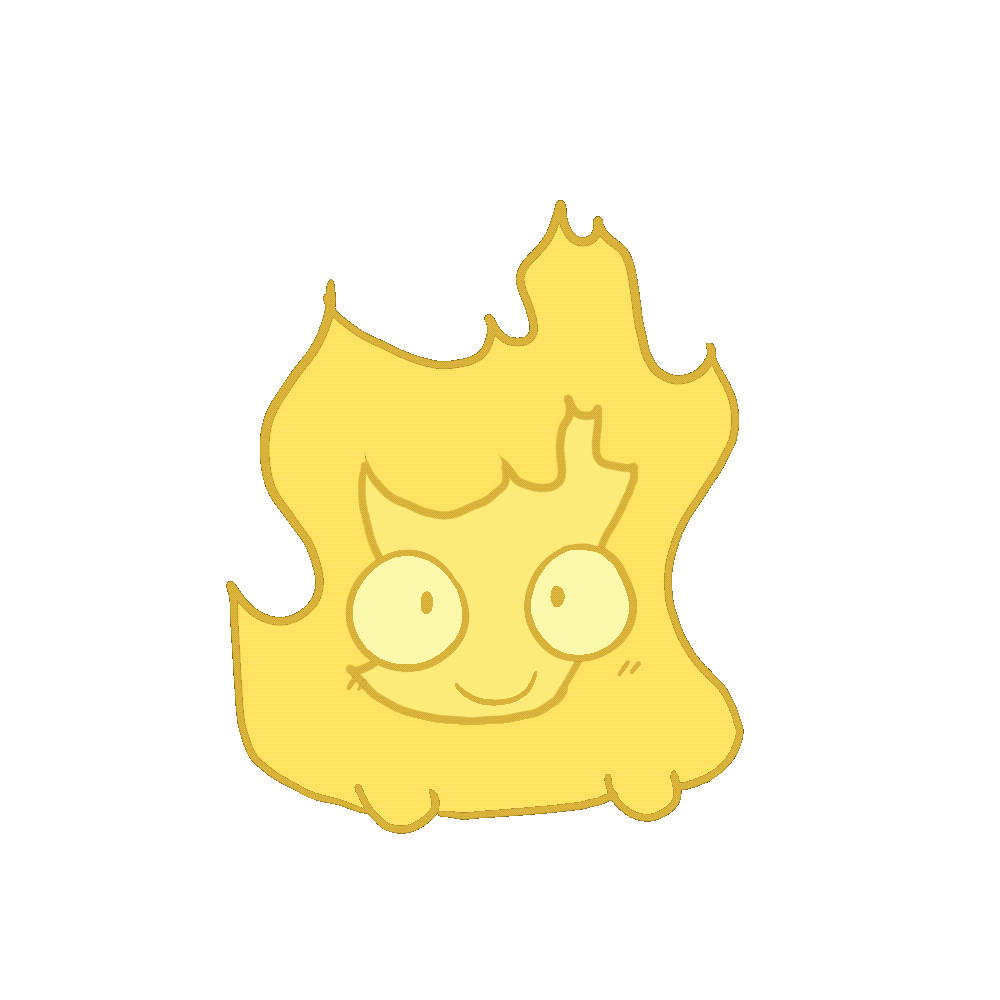 After I established the chemical colors, I received the line art for Calcifer's idle animation. I colored it in and added a cute face. The face wiggles around a bit to make the character come to life. And, as suggested by my teammate, I created a "look around" expression to break things up a bit.